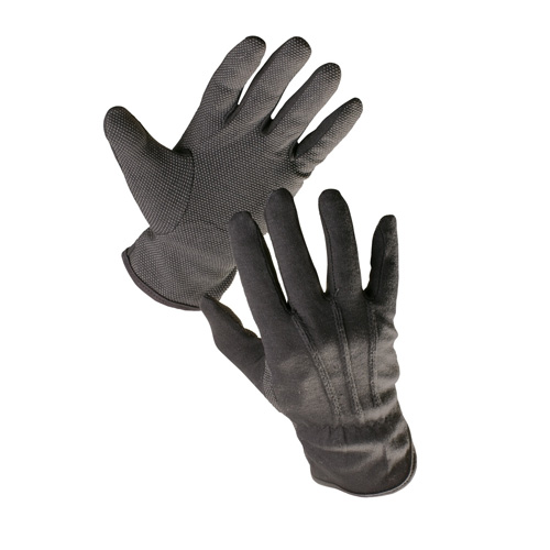 Rukavice šité z bavlněného úpletu, s PVC terčíky v dlani a na prstech, pružinkou na horní části zápěstí, bez manžety.