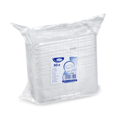 Průhledné plastové víčko určené pro uzavření hranatých vaniček, zajišťující bezpečné skladování a transport potravin.