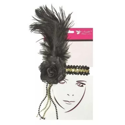 Ozdobná látková čelenka s flitry a peřím, ideální doplněk na karneval, párty nebo vystoupení. Stylově laděná do atmosféry 20. let, vhodná pro tematické večírky nebo retro akce.