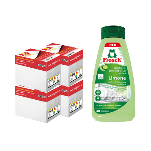Akce leták - kancelářský papír PAPE - 4x karton + Frosch eko gel do myčky 40 PD