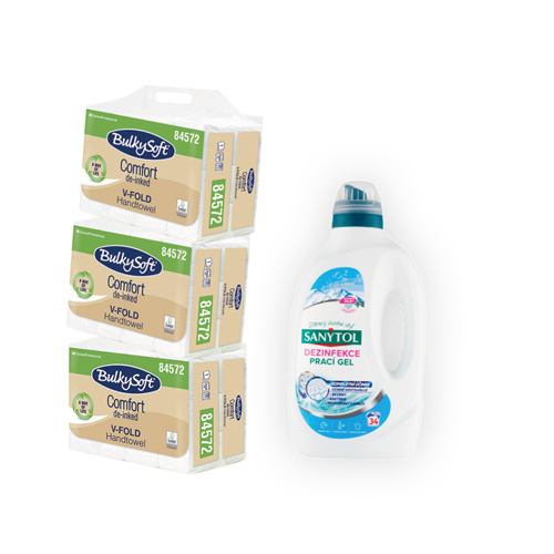 Akce leták - ručníky Z-Z taška 2 vrstvy - 4x karton + Prací gel dezinfekce Sanytol, 1,7 l, 3