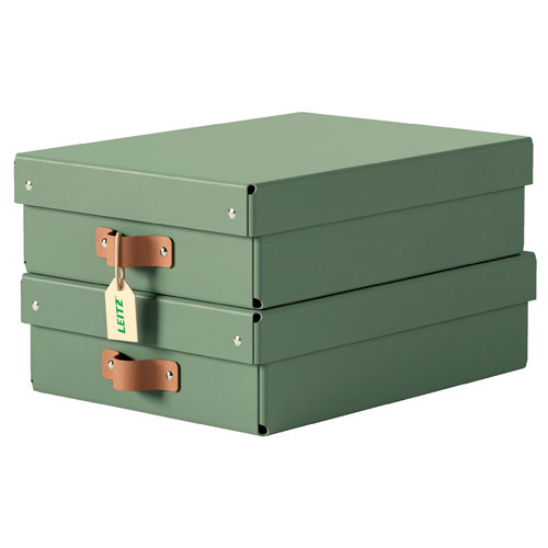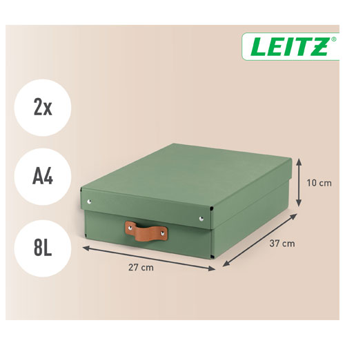 Stylová a praktická sada dvou úložných boxů Leitz s víkem je vyrobena ze 100 % recyklované lepenky s certifikátem FSC. Moderní čistý design v jemných přírodních odstínech se skvěle hodí do domácnosti i kanceláře. Boxy nabízí univerzální využití pro přehledné uložení dokumentů formátu A4, 14" notebooky, hračky, potřeby pro kutily a výtvarníky, pro uspořádání doplňků ve skříni, které zůstanou pohromadě a snadno přístupné.
