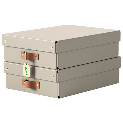 Stylová a praktická sada dvou úložných boxů Leitz s víkem je vyrobena ze 100 % recyklované lepenky s certifikátem FSC. Moderní čistý design v jemných přírodních odstínech se skvěle hodí do domácnosti i kanceláře. Boxy nabízí univerzální využití pro přehledné uložení dokumentů formátu A4, 14" notebooky, hračky, potřeby pro kutily a výtvarníky, pro uspořádání doplňků ve skříni, které zůstanou pohromadě a snadno přístupné.