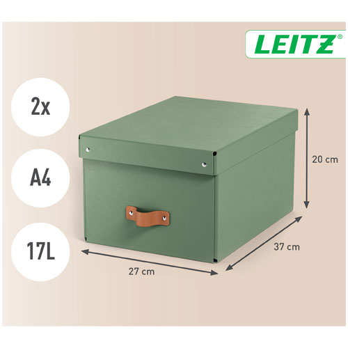 Stylová a praktická sada dvou úložných boxů Leitz s víkem je vyrobena ze 100 % recyklované lepenky s certifikátem FSC. Moderní čistý design v jemných přírodních odstínech se skvěle hodí do domácnosti i kanceláře. Boxy nabízí univerzální využití pro přehledné uložení dokumentů formátu A4, 14" notebooky, hračky, potřeby pro kutily a výtvarníky, pro uspořádání doplňků ve skříni, které zůstanou pohromadě a snadno přístupné.