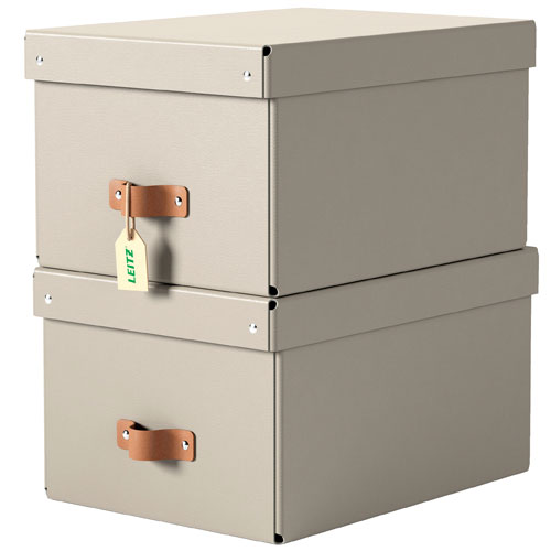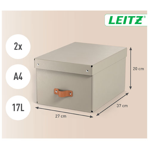 Stylová a praktická sada dvou úložných boxů Leitz s víkem je vyrobena ze 100 % recyklované lepenky s certifikátem FSC. Moderní čistý design v jemných přírodních odstínech se skvěle hodí do domácnosti i kanceláře. Boxy nabízí univerzální využití pro přehledné uložení dokumentů formátu A4, 14" notebooky, hračky, potřeby pro kutily a výtvarníky, pro uspořádání doplňků ve skříni, které zůstanou pohromadě a snadno přístupné.