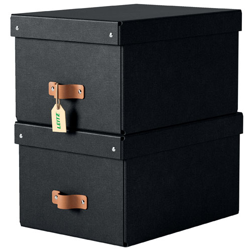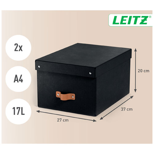 Stylová a praktická sada dvou úložných boxů Leitz s víkem je vyrobena ze 100 % recyklované lepenky s certifikátem FSC. Moderní čistý design v jemných přírodních odstínech se skvěle hodí do domácnosti i kanceláře. Boxy nabízí univerzální využití pro přehledné uložení dokumentů formátu A4, 14" notebooky, hračky, potřeby pro kutily a výtvarníky, pro uspořádání doplňků ve skříni, které zůstanou pohromadě a snadno přístupné.
