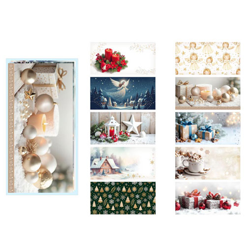 Dodejte svým vánočním přáním skutečně elegantní podobu. Tato vánoční dopisní obálka DL je ideální pro novoročenky, přání i dárkové poukazy, které chcete předat slavnostně a originálně. Nabízí se v několika motivech – od kouzelných zimních krajin a andělíčků až po moderní dekorace s ozdobami a svátečně zabalenými dárky.