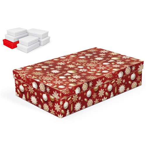 Elegantní vánoční balení pro vaše dárky – pevná dárková krabice s víkem v červeném provedení se zlatými a bílými motivy vloček, hvězd a ozdob dodá každému dárku slavnostní vzhled.
