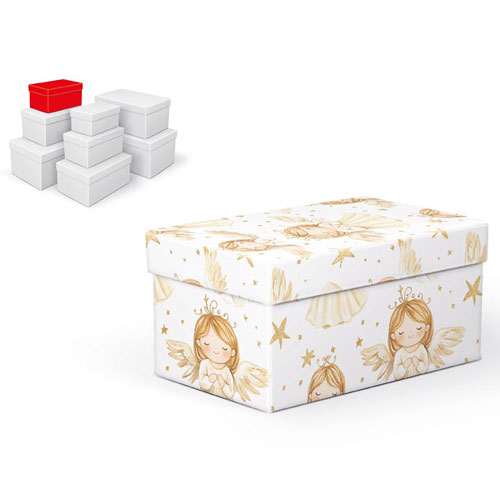 Elegantní a rychlé balení vánočních dárků – krabička s motivem andílků a zlatých hvězdiček je ideální volbou pro ty, kteří chtějí dárky zabalit reprezentativně a bez zbytečného času. Její slavnostní vzhled dodá každému dárku jedinečné kouzlo Vánoc.