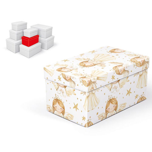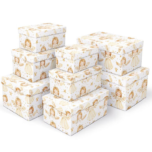 Elegantní a rychlé balení vánočních dárků – krabička s motivem andílků a zlatých hvězdiček je ideální volbou pro ty, kteří chtějí dárky zabalit reprezentativně a bez zbytečného času. Její slavnostní vzhled dodá každému dárku jedinečné kouzlo Vánoc.
