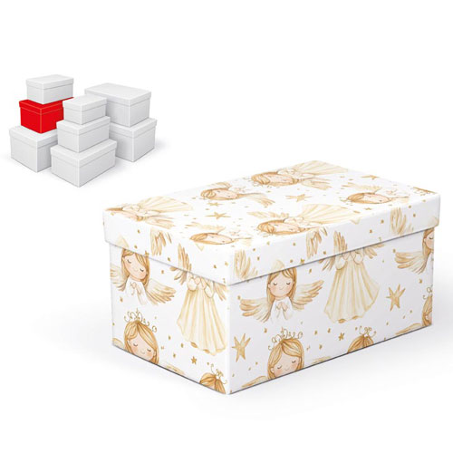 Elegantní a rychlé balení vánočních dárků – krabička s motivem andílků a zlatých hvězdiček je ideální volbou pro ty, kteří chtějí dárky zabalit reprezentativně a bez zbytečného času. Její slavnostní vzhled dodá každému dárku jedinečné kouzlo Vánoc.