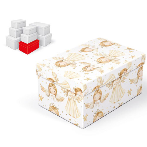Elegantní a rychlé balení vánočních dárků – krabička s motivem andílků a zlatých hvězdiček je ideální volbou pro ty, kteří chtějí dárky zabalit reprezentativně a bez zbytečného času. Její slavnostní vzhled dodá každému dárku jedinečné kouzlo Vánoc.