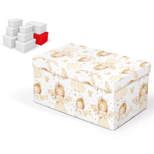 Elegantní a rychlé balení vánočních dárků – krabička s motivem andílků a zlatých hvězdiček je ideální volbou pro ty, kteří chtějí dárky zabalit reprezentativně a bez zbytečného času. Její slavnostní vzhled dodá každému dárku jedinečné kouzlo Vánoc.