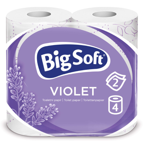 Toaletní papír Big Soft Violet – Pevný, jemný toaletní papír dekorovaný decentním potiskem v barvě lila. Balení obsahuje 4 role po 190 útržcích, což je optimální velikost do menší domácnosti. Složení: 100% celulóza.