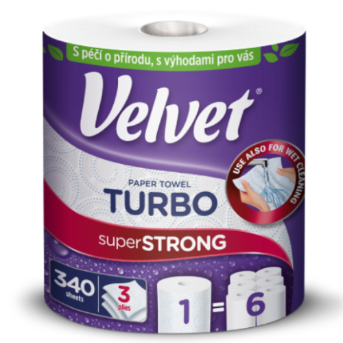 Výjimečně účinná papírová utěrka Giga role Velvet Turbo. Její vysoká účinnost a pevnost pomohou vyčistit rychle každou místnost ve vaší domácnosti. 3 vrstvy bílého hedvábného papíru skvěle pohlcují vlhkost. Utěrka je bezpečná při kontaktu s potravinami, rychle a účinně odstraní skvrny a nečistoty z pracovních desek a kuchyňských skříněk. Ideální do kuchyně. Utěrka Velvet Turbo je skvělou volbou pro generální úklid domu nebo bytu.